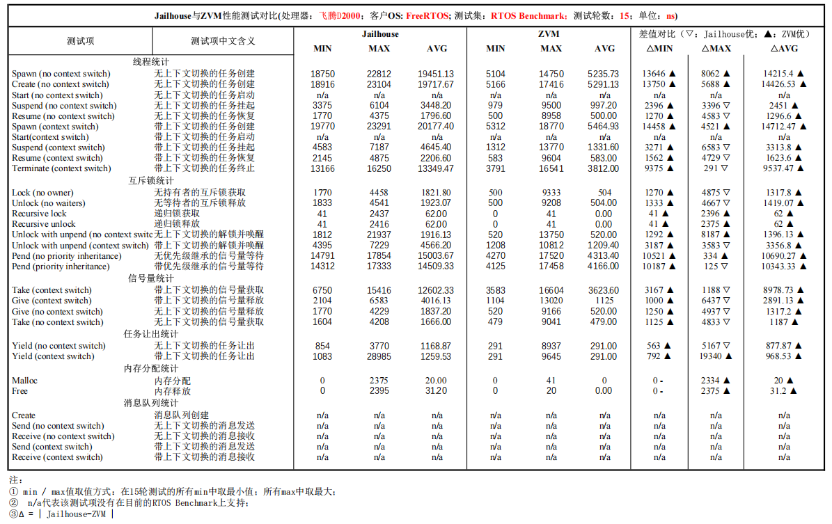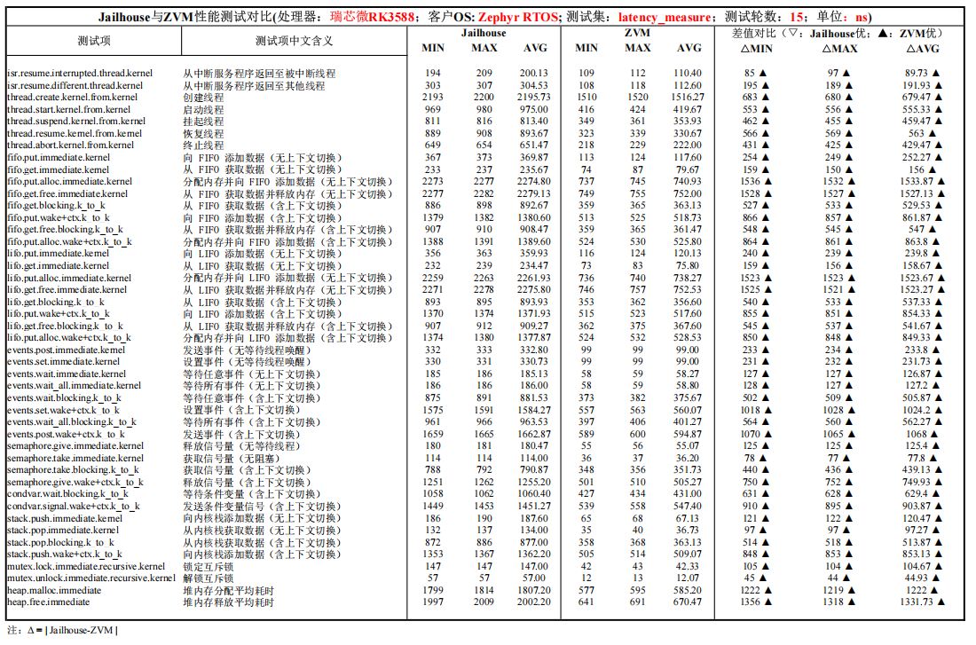 以 Jailhouse运行FreeRTOS(采用RTOS Benchmark [1])和Zephyr RTOS(采用latency_measure [2])的性能为基准,ZVM 在瑞芯微RK3588、飞腾E2000及飞腾D2000三种处理器平台上均取得了更优结果。